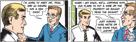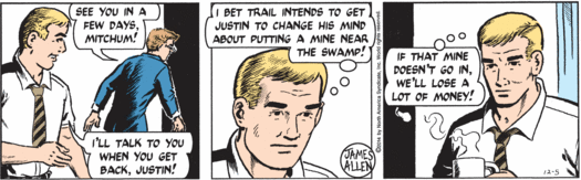 Mark, now so pleased with himself, his face so aglow with pure rapture that it’s drawing Cherry into the caper, we now get to see Justin Holland in his thoughtful and pensive state… And we soon get to be introduced to the real villain- Mitchum- who “single-handedly arranged the purchase of the property near the GREAT swamp…”