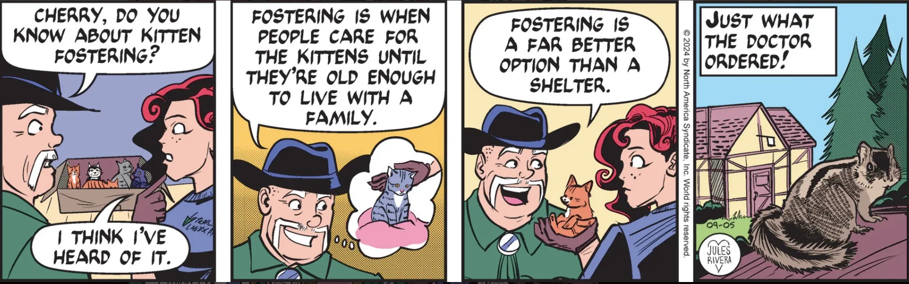 Here, Rivera pokes fun at the trope by having Violet’s hanky fly outside of the circle as she sneezes, thereby suggesting that it actually does inhabit the outside space, alongside the snake. The illusion is enhanced by having the snake look at Violet (or her hanky). Without that flying hanky, the effect of the joke is less dramatic. So props to Rivera. But the less said about Violet’s image, the better. On the other hand, Rivera does a fine job depicting Violet’s suffering in panel 2. Looking at her makes me want to grab for my own nasal spray!