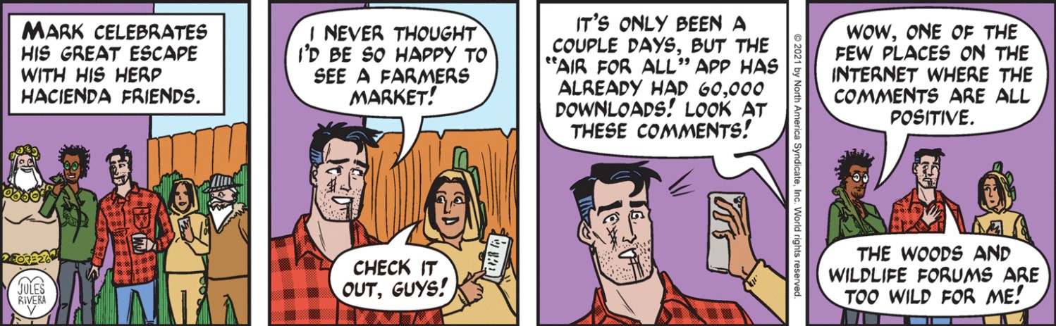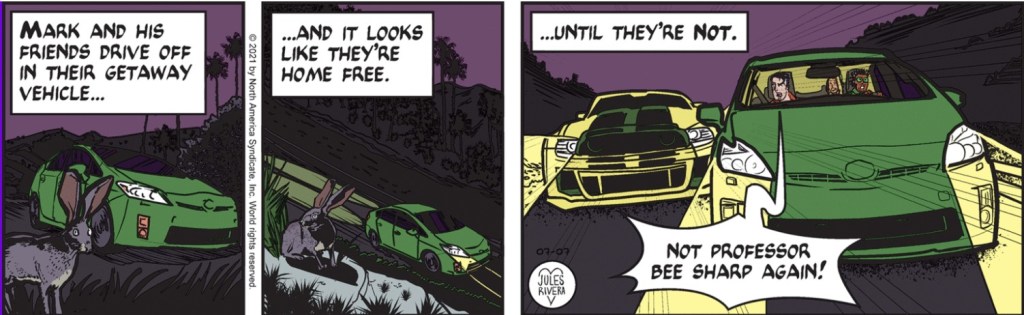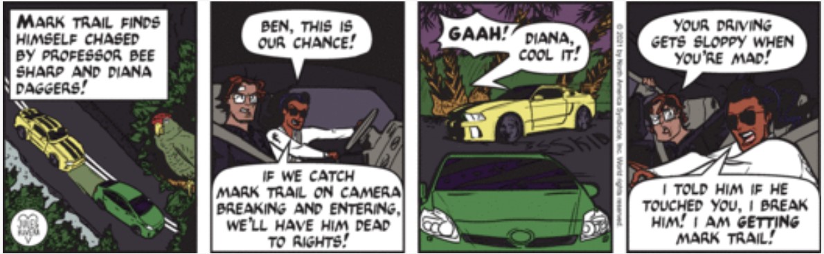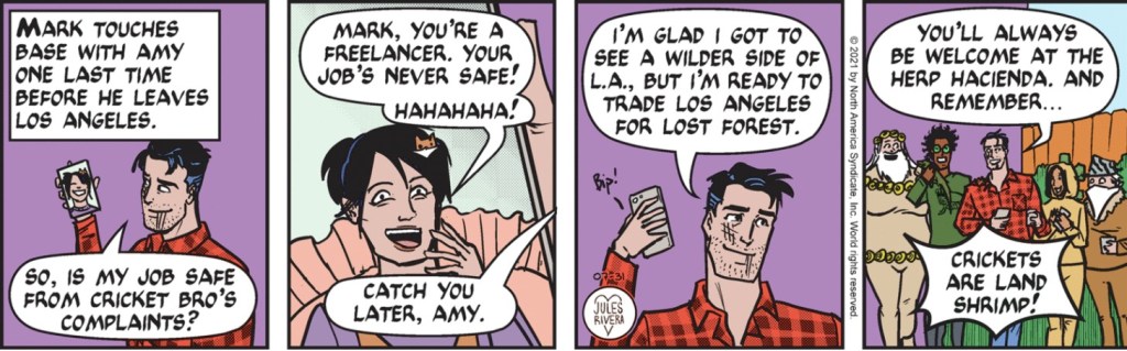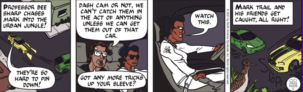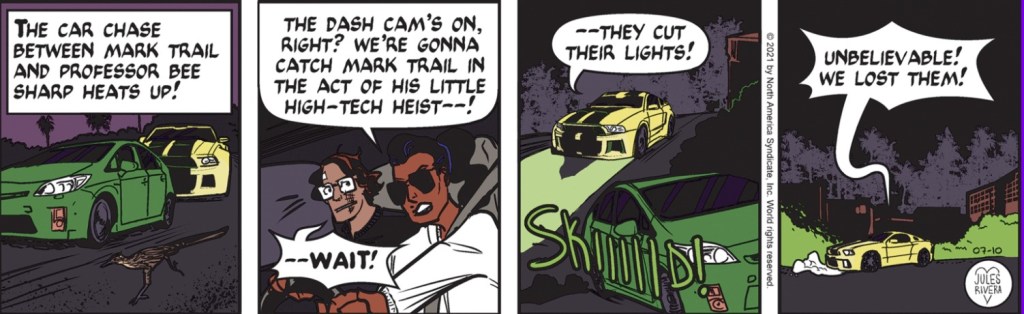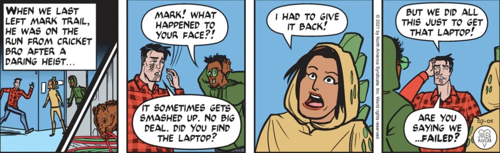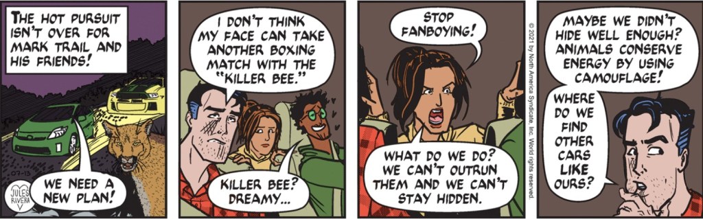 I think many of us will agree that this is not the strongest ending to a Mark Trail story, though it is not much worse, either. Aside from the dodgy animal air check app, this story seemed to be a series of unresolved, random vignettes. I’ve never been a professional comic strip artist, but I’ve played one in my head, and I know that there can be tremendous pressure to put out a 7-day comic strip. In fact, have we not seen other cartoonists these days going on hiatus every so often, content to rerun older strips in order to get away from the pressure? Or, perhaps to catch up? And perhaps Rivera deliberately constructed this story in a way that would mimic or rip some Mark Trail story memes sure to raise the blood pressure of Trailheads. Or, maybe Rivera is just ripping the old-fashioned notion that a Mark Trail story should follow conventional norms.