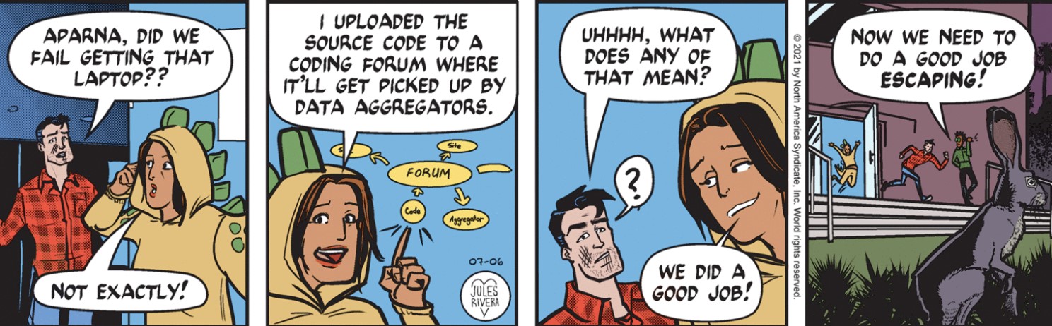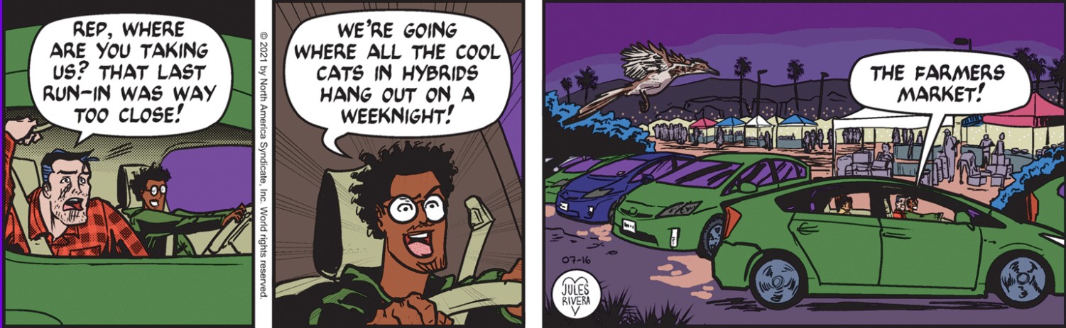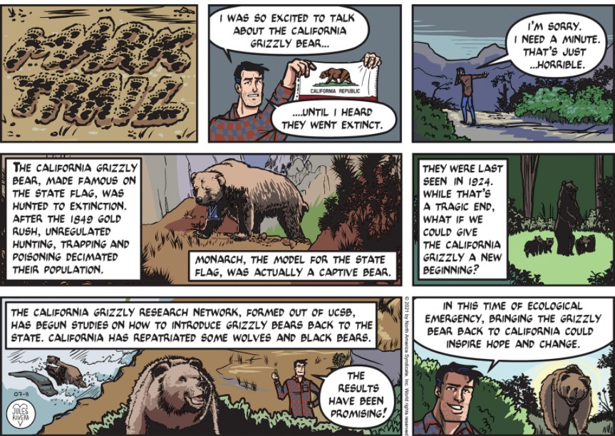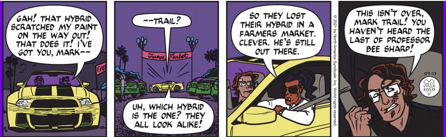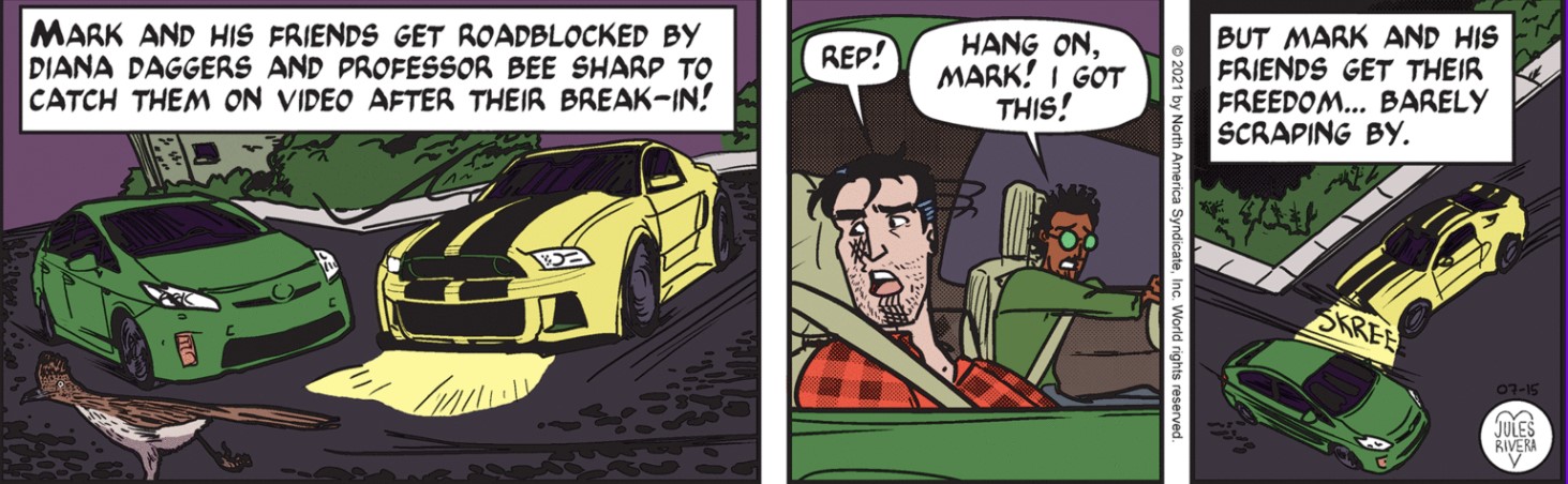 I think many of us will agree that this is not the strongest ending to a Mark Trail story, though it is not much worse, either. Aside from the dodgy animal air check app, this story seemed to be a series of unresolved, random vignettes. I’ve never been a professional comic strip artist, but I’ve played one in my head, and I know that there can be tremendous pressure to put out a 7-day comic strip. In fact, have we not seen other cartoonists these days going on hiatus every so often, content to rerun older strips in order to get away from the pressure? Or, perhaps to catch up? And perhaps Rivera deliberately constructed this story in a way that would mimic or rip some Mark Trail story memes sure to raise the blood pressure of Trailheads. Or, maybe Rivera is just ripping the old-fashioned notion that a Mark Trail story should follow conventional norms.