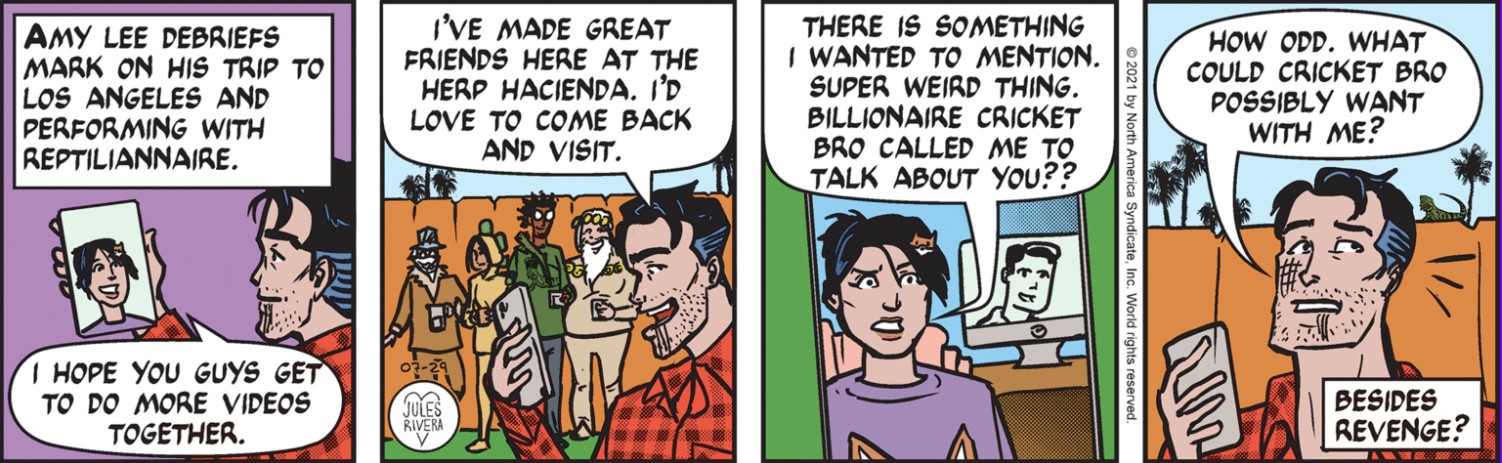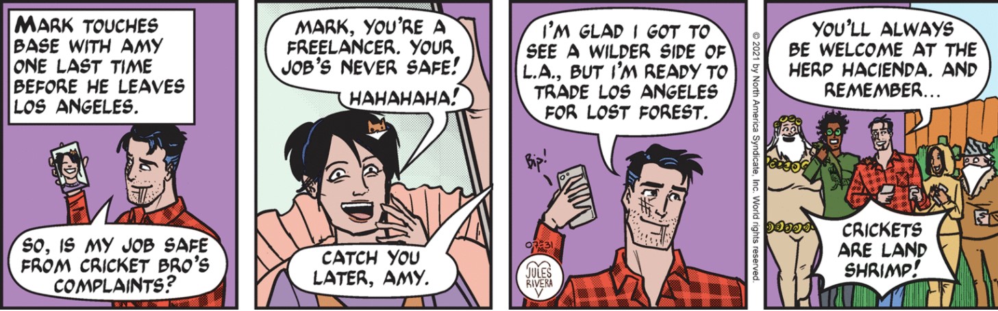 Okay, we must allow Jules to have her joke. Where is it? It is the 4th panel, where everybody is having some kind of vocal group hug and the speech balloon points to Mark, though the text seems to be something the other four would be telling Mark! Trailheads sometimes speak of older strips where dialog balloons on occasion seem to point to the wrong person, or thing. I admit that I was too lazy and tired to look through the backlog of strips, so feel free to add some footnotes in a response. In any event, it seems odd that Mark would be welcoming himself to Herp Hacienda, unless this is meant to be some kind of campy commercial where Mark and crew are actually welcoming us readers to come back. Well, thanks anyway.