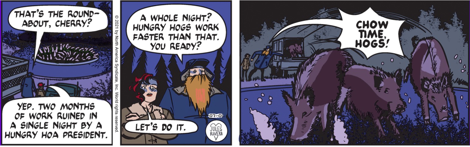 So we made it through another installment of Cherry’s Trail of Vengeance. Frankly, I’d like to see Rivera commit to story lines alternating every two weeks for Cherry and Mark. With the additional, continuous time, I think better continuity and pacing could be established. As it is, we moved through the execution of Cherry’s plan to stick it to the HOA by getting her reclusive, anti-government brother and his “feral” hogs to destroy the Butterfly bushes put in by the Sunny Soleil Society. Those of you coming in late should know that the SSS secretly and possibly illegally replaced Cherry’s original installation of indigenous plants at that faux roundabout. So this was tit for tat. Maybe. No doubt, there is some visceral satisfaction to seeing the work of your nemesis wantonly destroyed. But as in Mark’s case, we have moral and legal complexity here, as Cherry decided to take a vigilante approach to problem solving. Of course, this is an adventure strip, right?