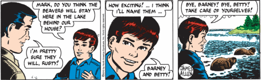 So with Barney and Betty looking on in confusion, still wondering what the hell they did to deserve being relocated, Father and son go home to greet Mom and recount lusty tails of fallen trees and watery rescues…