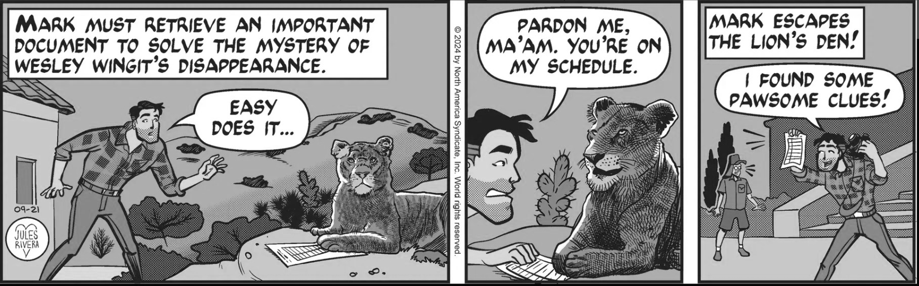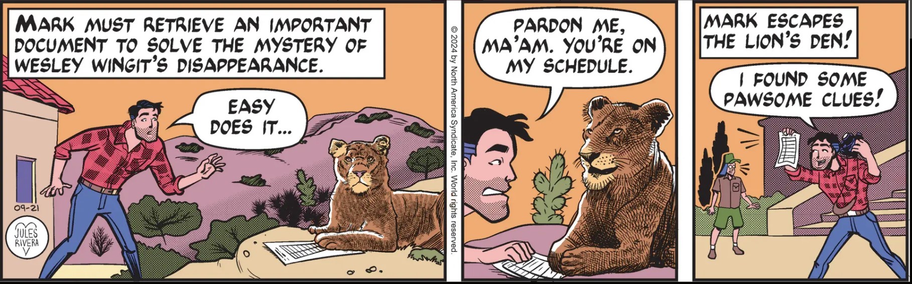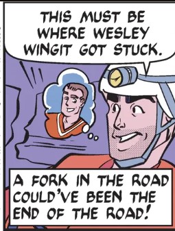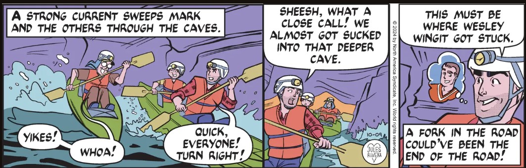 It’s nice to see that Rivera wants to make sure (panel 1) that we know that the person welcoming Mark and Rusty inside that “Lincoln Log” cabin is Cherry, though one could be forgiven for thinking they might have stepped into the wrong cabin, seeing as how it is much smaller and different than other illustrations.