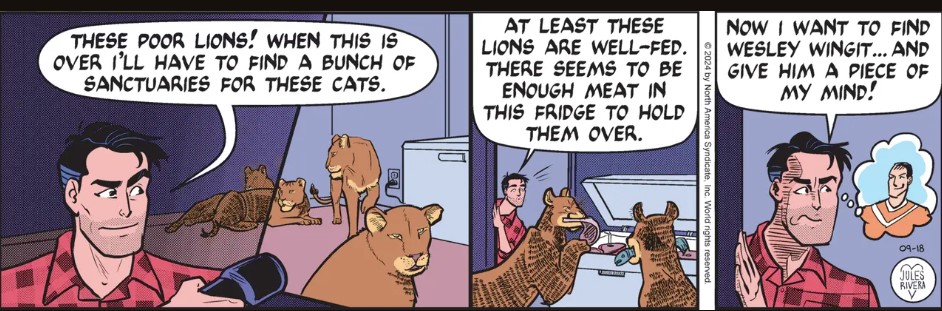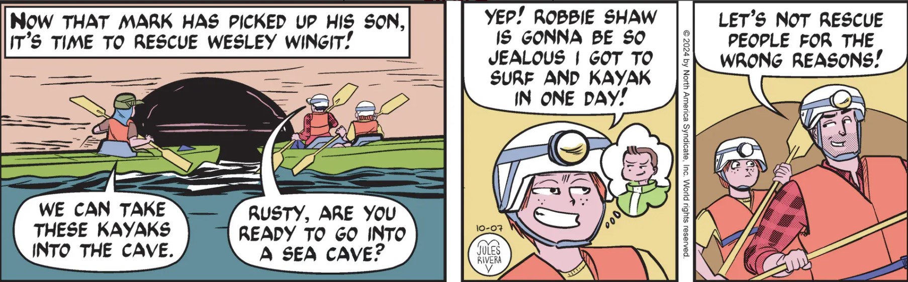 Come to think of it, that would make a great storyline for the strip, where the characters have to deal with the dangers and after-effects of a large-scale natural disaster. It would be a great time to finally show a serious side of the strip, dealing with real physical, emotional, and social problems. How about it, Rivera?