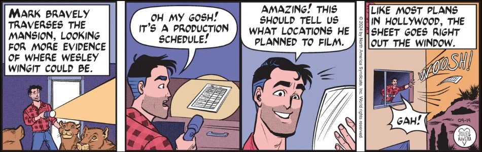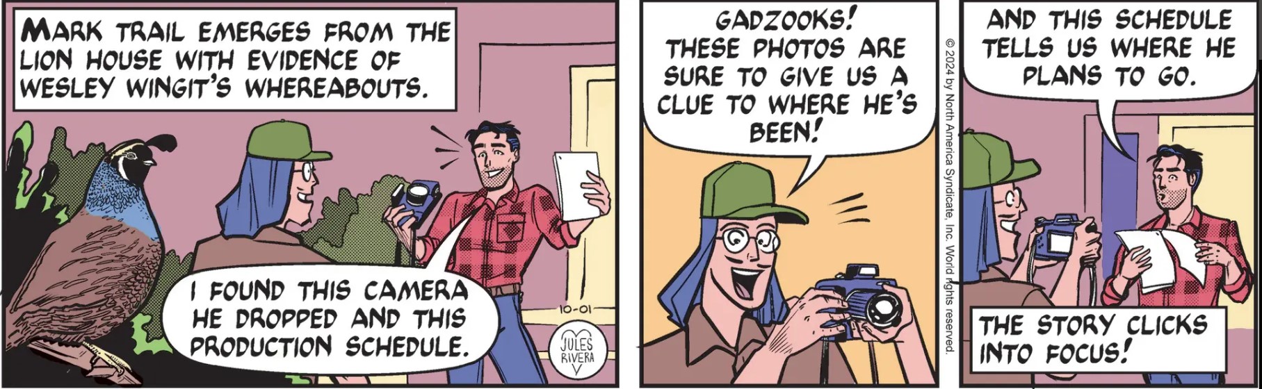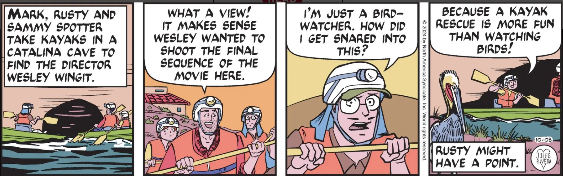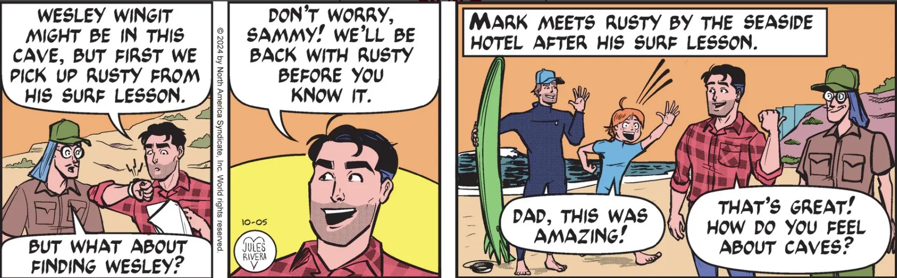 Rusty exuberantly reacting like a real kid in panel 3 instead of like his socially deprived presentation in the pre-Rivera strips adds the only bit of reality and humor to this otherwise traditional hokey homecoming (which is closer to the pre-Rivera spirit).