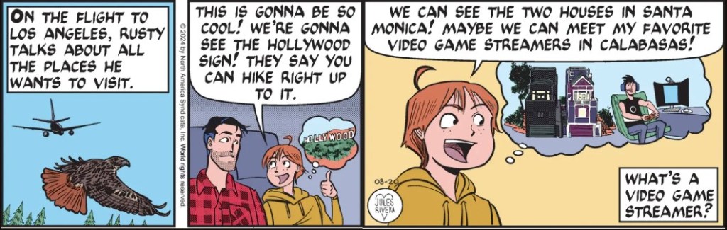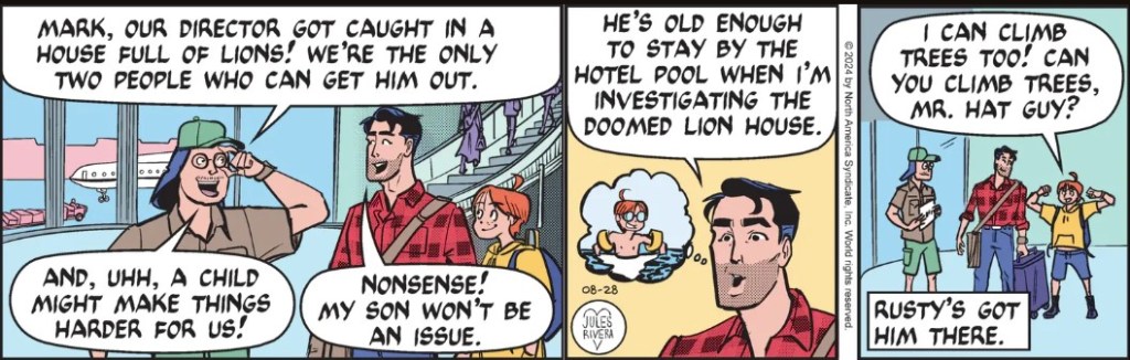 I wonder if Rivera thinks this strip comes out once a week, since she uses half of today’s space repeating what was covered yesterday. Perhaps she thinks she is being helpful to elderly Trailheads who still read this strip and who might appreciate the reminder. On the other hand, this reiteration is also a method for padding a story to slow the pace down and help it fill out the week. Perhaps that slick, single-panel-Rusty-drop-off yesterday moved too quickly for an old comic strip like this and it just needs a breather.