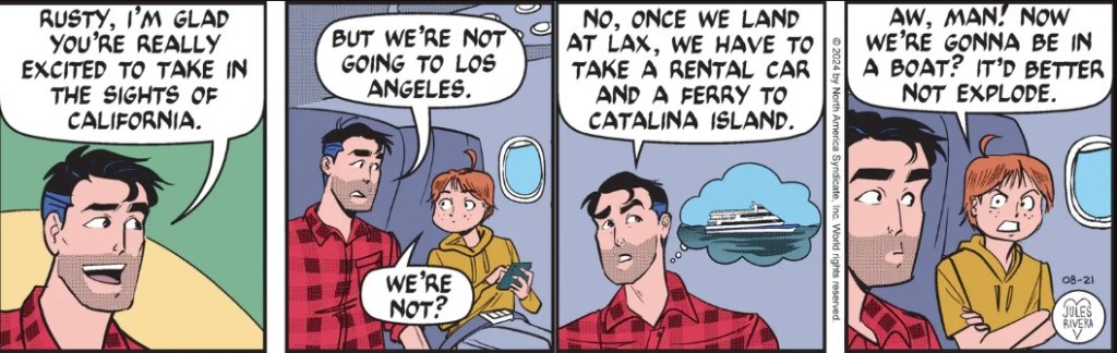 I suppose I should have thought more about this “week-long” plane ride (including today’s strip) that I criticized the other day. I might have recognized that Rivera extended the flight for the entire week to suggest the lengthy flight, itself. However, there was nothing in the dialog or body language of Mark and Rusty to reinforce this interpretation. Now, there were several ways to portray a flight. Rivera chose an approach that focused less on the plane and more on conversation, ignoring flight attendants, drink service, and looking out of the window.