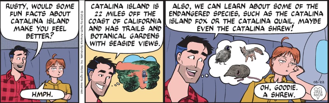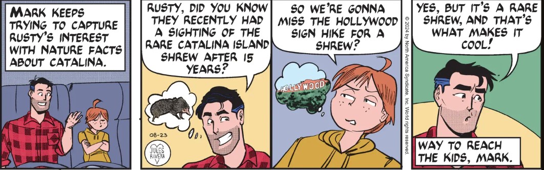 Getting back to today’s strip, spotting a Catalina Island Shrew would be a very major deal. In addition to being extremely rare (and rarely observed), they are very small and mostly nocturnal. This mammal is destined to be a Sunday nature topic!