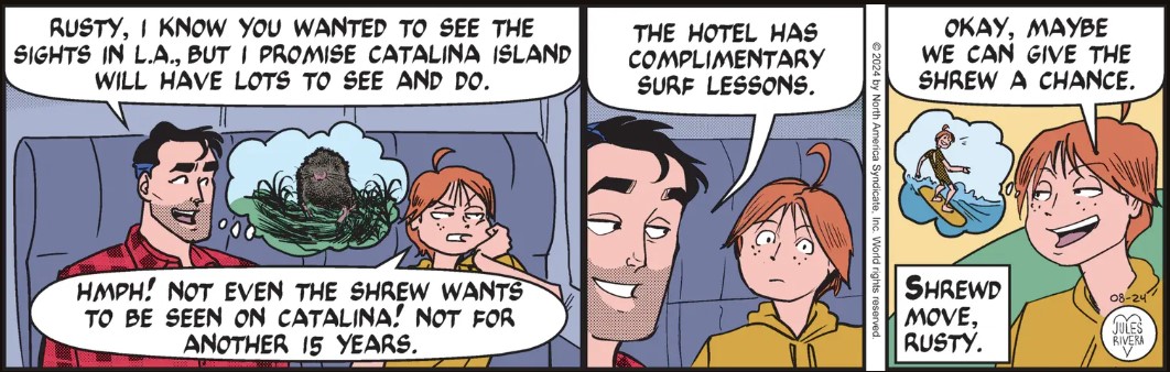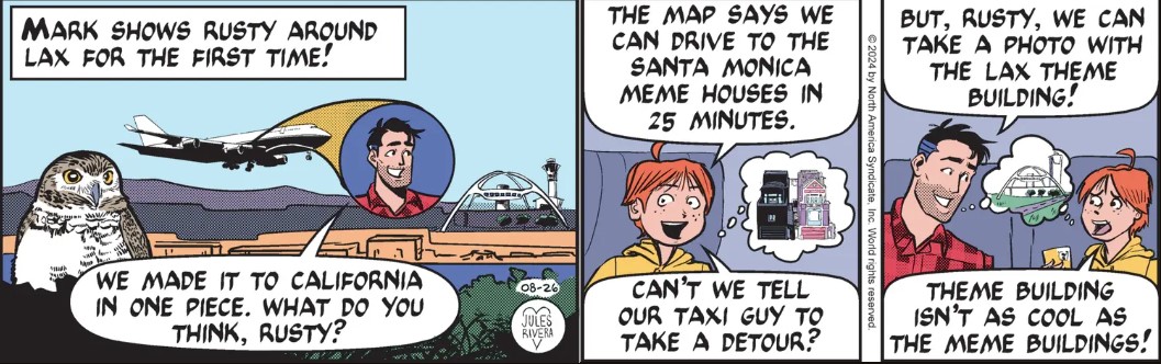 Okay, is there a point to Rusty’s pointless babbling? Is Rivera just trying to give a little peek at Mark and Rusty passing the time on a plane to California? Or maybe padding the story to fill out the week? Or maybe hinting at a plot contrivance that will show up down the road? Like, what are the odds that one of those two houses turns out to be Mark’s lion house?