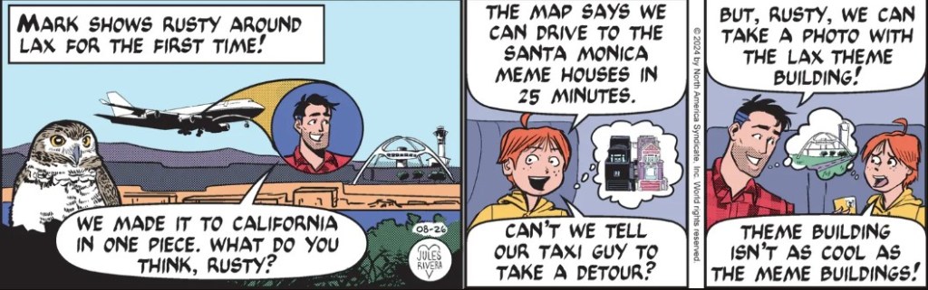 The blowout of Mark in panel 1 is a nice way to focus on a person talking inside something (like the plane), while looking at the thing’s exterior. The panoramic view of a plane landing at LAX is also a good compositional idea, though it suffers from crowding too much text along with an extraneous owl in the panel. The chosen view also seems too close to suggest the expanse of the airport. Emphasizing the airport by showing it from a greater distance would reinforce the idea of airport. I think the Theme Building would still be recognizable from a greater distance.