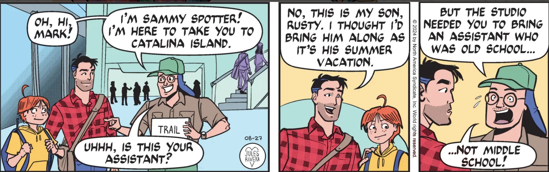 I appreciate the fact that Rivera was able to telescope Rusty’s departure from the story in such an efficient and encapsulated fashion (panel 1). It’s a technique she should employ more often to keep a story moving along. And how Mark was able to get somebody else to pay for Rusty’s airfare and expenses for doing nothing more than hanging out should earn him an award for his powers of persuasion or maybe just bald-faced deception.