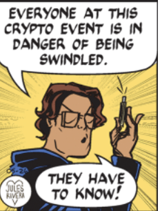 Still, I reckon some of them might look at this like a stockbroker who buys in a slump, believing the stocks will eventually rise and pay off. But let’s face it: The point of this adventure is to trash NFTs, block chains, and crypto currency; not to praise them. So there is clearly going to be a big hubbub.