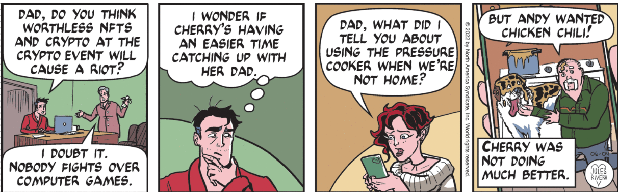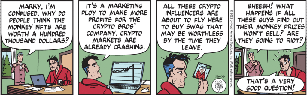 Oh, I remember now: They are talking about the “big crypto influencer event” that the Crypto Bros are putting on (see the April 4 strip). That explains the half-pipe, as well. I reckon guests can roast marshmallows over the coals of the surrounding forest fire.