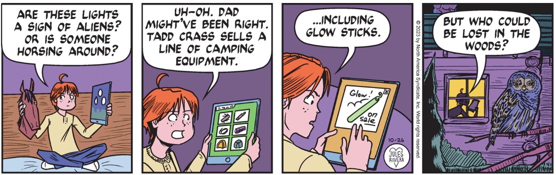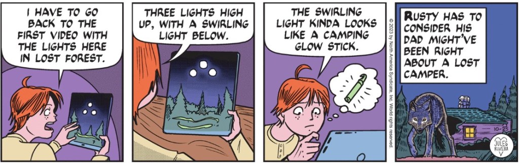So, fine. Analyst Rusty Trail interprets the swirling green light as a glow stick. Seems reasonable. But what about those three lights? They are obviously too big to be stars. And their arrangement is too ordered. While Rusty ponders whether Pop’s tuition is correct, maybe he and Mark are both right: Could be a lost extraterrestrial camper, filmed while signaling to his/her/its overhead ship. But I don’t think Rivera is prepared to take this strip that far into fantasy.