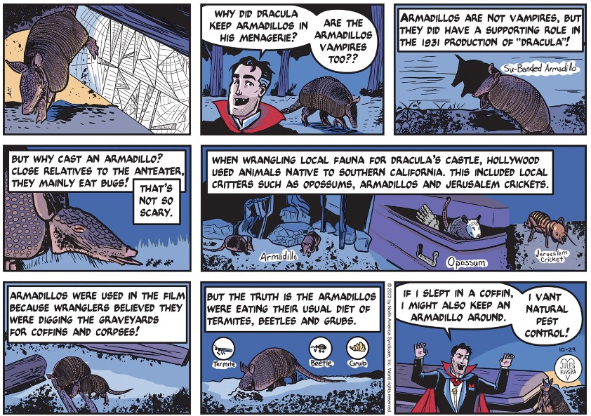 Speaking of animals, that must be a nine-banded armadillo in panel 2, the only species known to inhabit the United States, at least in the south. See?! Anybody can sound smart with some good online searching. But it sure looks oddly placed in the panel, don’t you think?