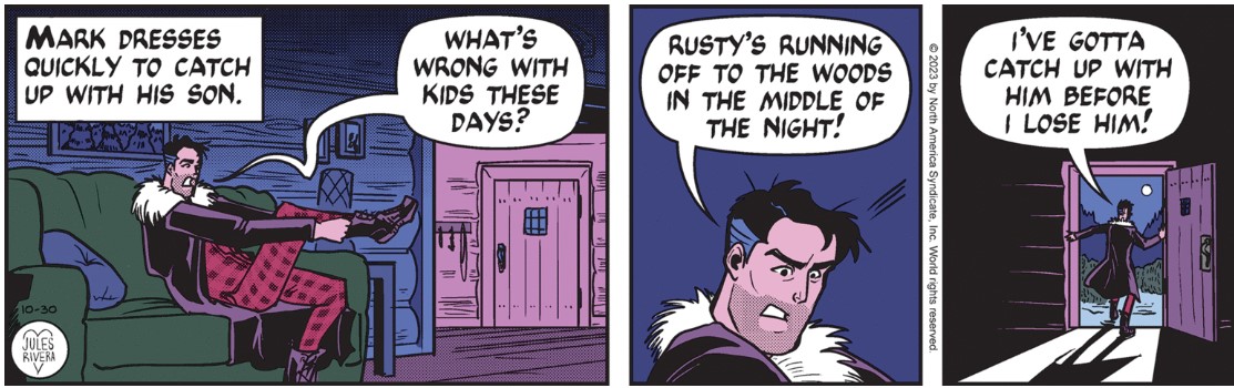 Well, who could have seen this coming!? And what a non-surprise it is. Yet I have to admit that Mark’s expression in panel 3 is classic comedy. I wonder what that mysterious yellow light is outside of the front door where Rusty and Andy are exiting. Notice that Rusty and Andy even cast shadows on the floor. Could the front yard have motion lights? By the time Mark makes it to the front door in panel 4 the outside is dark as night, as one should expect. And he casts no shadow at all. Spooky, I tell ya!