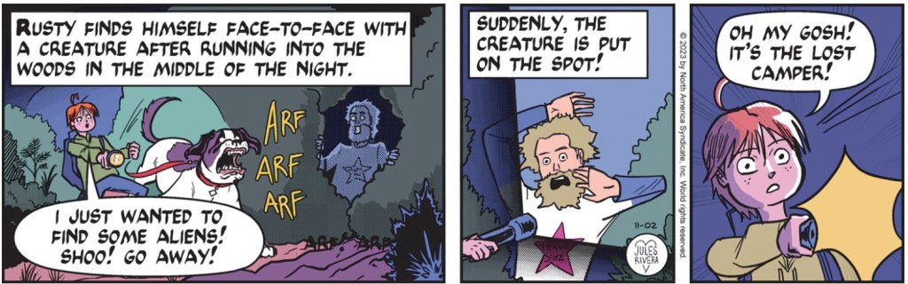 Why does Rivera continue to call this person a creature, when it is clearly a person? Perhaps it is meant to be understood from Rusty’s still-limited understanding. But I also do not understand Rusty’s reaction: “I just wanted to find some aliens! Shoo! Go away!” Aside from the old-school Mark Trail grammar, is Rusty talking to the guy in the bushes? Why shoo him away? Also noted: Why are there two small “Arf!” barks lettered at the base of the bushes in panel 1? Could there be a creature off-scene that we cannot yet see?
