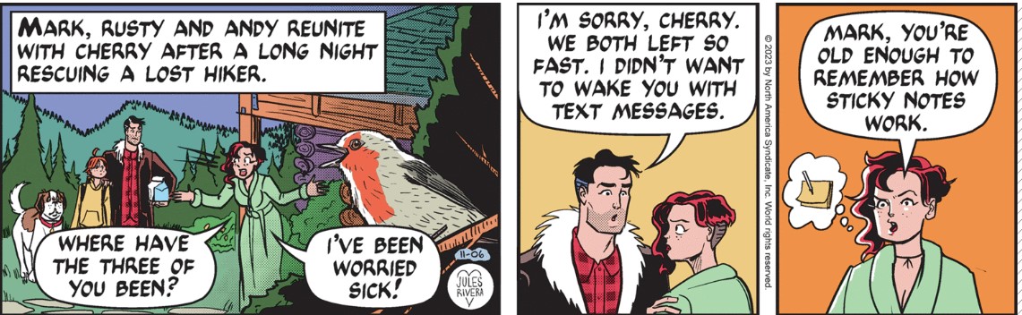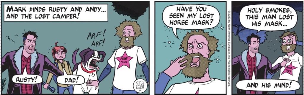 On Saturday’s strip we might find Mr. Lost Camper settling down to tell his story. Or maybe Mark gets the guy into a hospital. But we’ve now had three weeks dedicated to Rusty’s story. Will Rivera jump back on Monday for a week with Cherry or will she allow this adventure to continue?