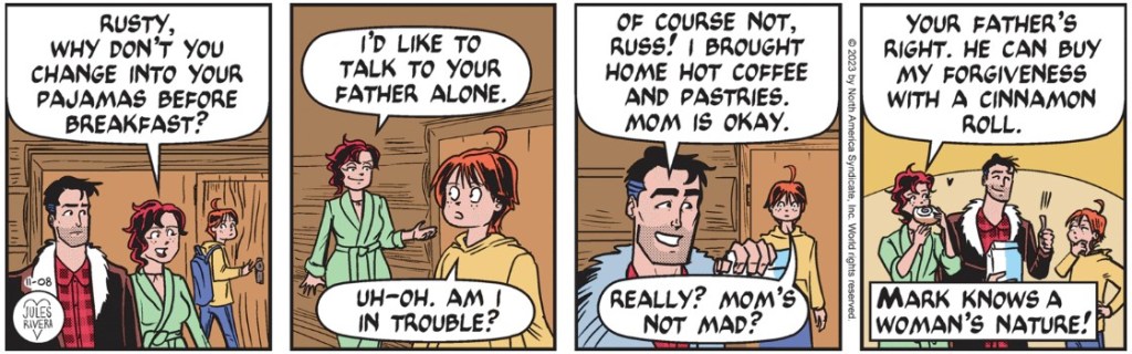 Okay, the epilogue to Rusty’s adventure seems to be playing out as expected: Get home, run into Cherry, start in with excuses and then explanations. But I have one question: What’s in the container that Mark is carrying in panel 1? Perhaps he and Rusty stopped by Squirrely Sandy’s bakery in town. Wouldn’t that be a hoot!?