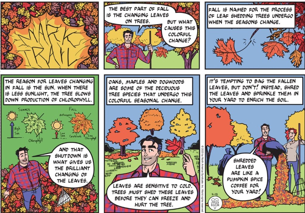 Getting back to the title panel, I don’t think constructing the strip’s title using leaf veins is successful. It’s just too busy and forced. A more successful result might have been made using the stems of leaves, or maybe a combination of leaf stems plus the leaves. Well, it works in my head, anyway.
