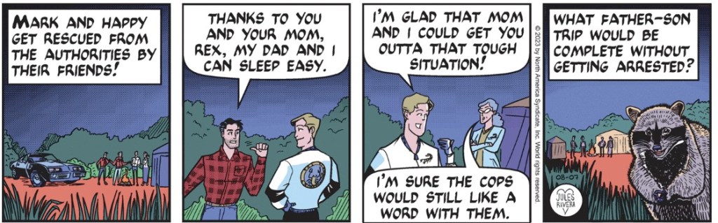 The police chased the quartet of scofflaws as they sped away, out of town. Along the way, Happy and Rex’s mom shared a nostalgic moment about the ’70s. The chase culminated in a cinematic car jump across a missing section of bridge. Such an attempt would spell doom to any other vehicle not equipped with a JATO rocket. There you have the week! And here you have the Sunday lesson!