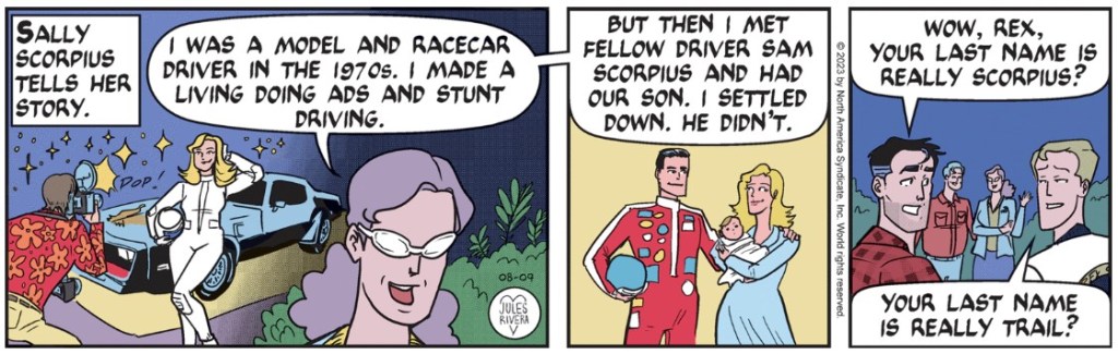 Props to Rex for his spot-on reply to Mark in panel 3. Now, some people never move past their glory days, be it high school football fame or a babe who put the “hot” in hot wheels. Thus, Sally repeats the days of her glorious youth. Either she thinks Happy has a short memory or maybe she does. Or maybe she just likes to talk about it.