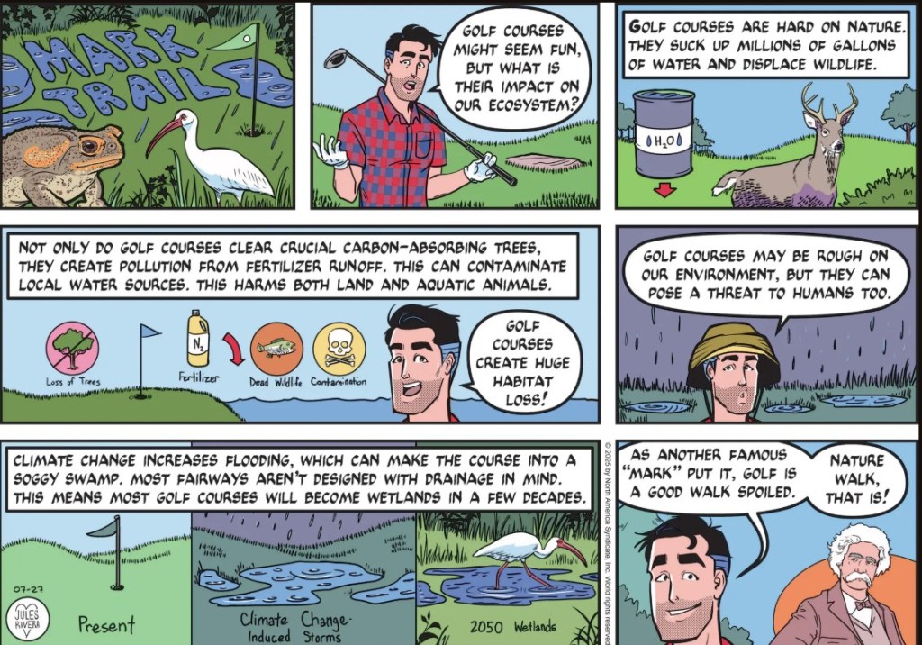 Now, I have no idea what Mark is getting at in the last panel. Style over substance? What substance? Is Mark suggesting that more expensive clothing doesn’t also get discarded and sometimes wind up in landfills and floating garbage pits?