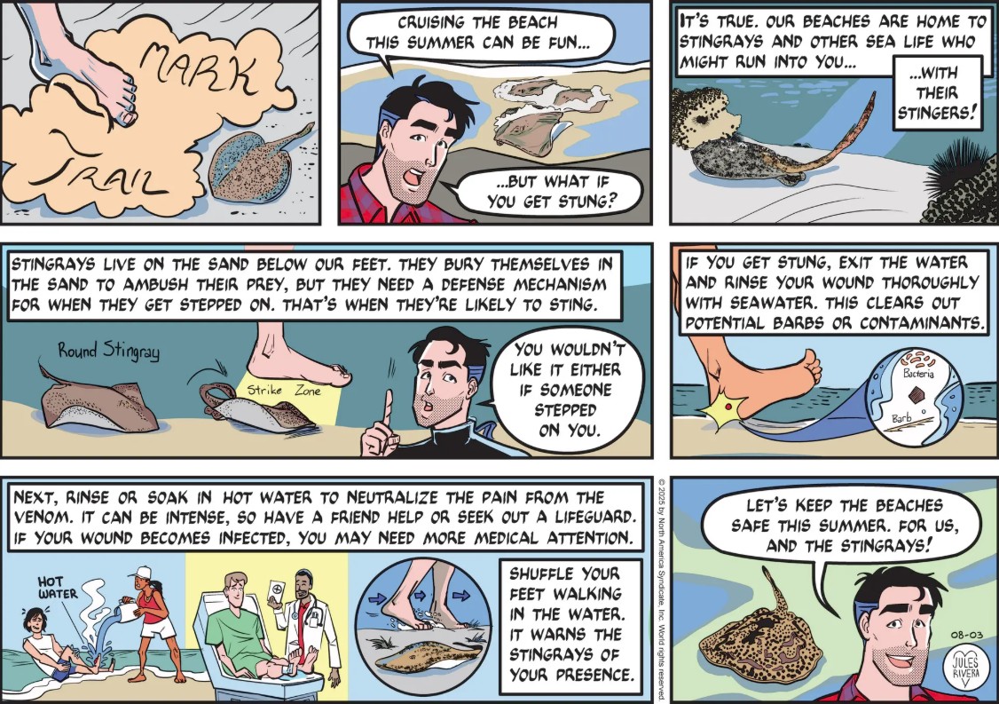 We’ve already spent several weeks reading Cherry’s adventure and learning about fast fashion and its effects on the environment. So why does Jules Rivera devote a Sunday page to repeating this information? Well, curious readers, Rivera is using the topic to pivot to a more general screed on the pollution effects of plastics and dyes in our oceans. Floating islands of rubbish, discarded clothing, and other garbage certainly do exist and create problems for sea life, shipping, and beaches.