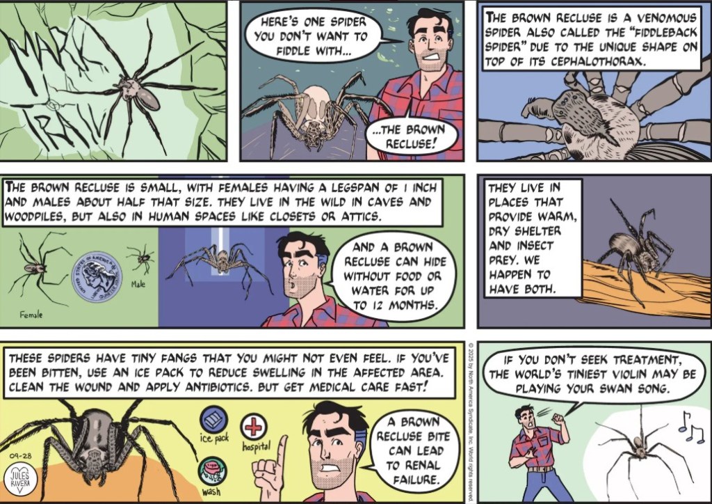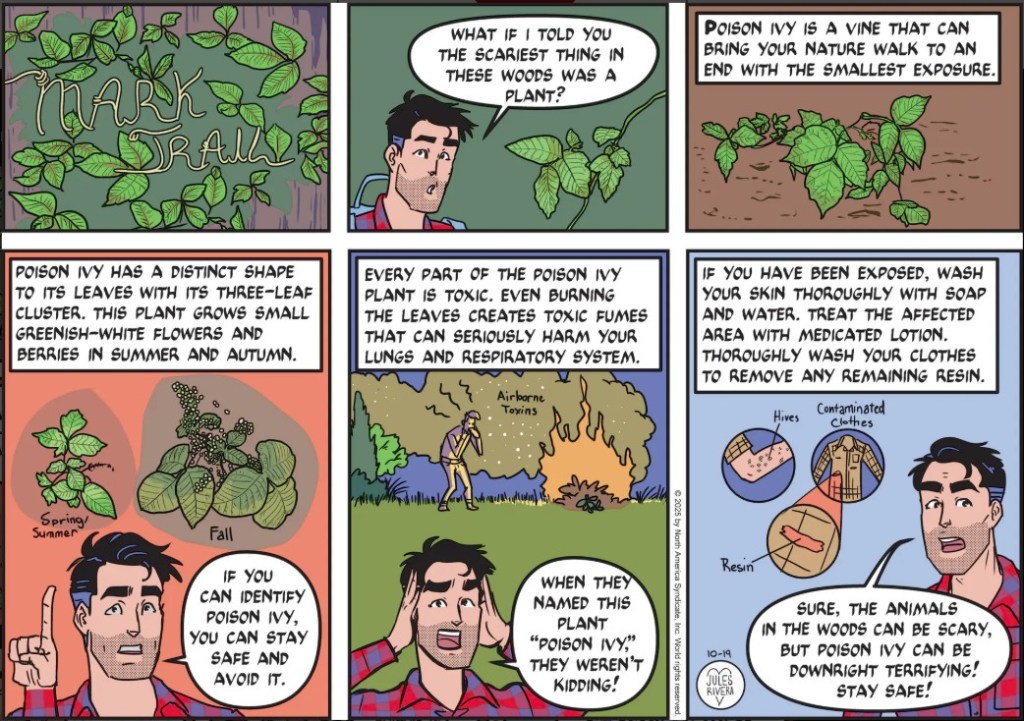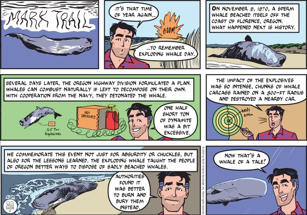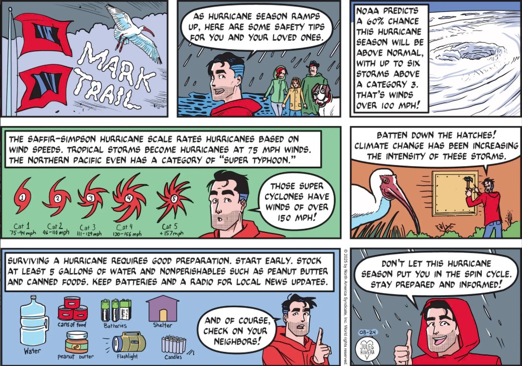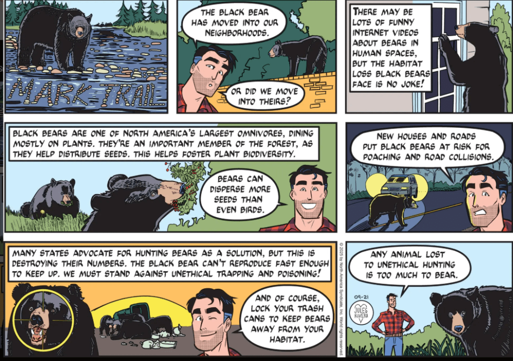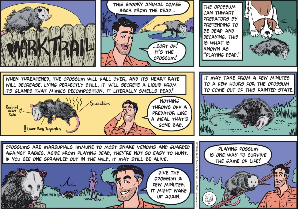 Here we see again Rivera giving mixed signals. Why is Mark holding a model WWI biplane and smiling as he concludes his ominous message? Why is there a deer in panel 4 expressing surprise? Rivera used to brag about how much time and effort she puts into the Sunday page. That certainly isn’t evident in today’s work. It looks rushed and simplistic. Ed Dodd thought it important enough to hire an artist whose only job was to prepare the Sunday page. Unfortunately, I don’t think Rivera gets paid anywhere near enough for that luxury.