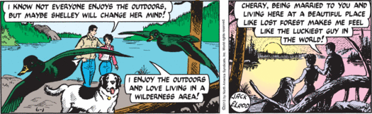But really, as usual, can more stilted and awkward prose be committed to a comic strip ( or any media for that matter?) What if “living in the outdoors” is really a metaphor for… Oh, probably shouldn’t go there… Like Jeff Spicoli in “Fast Times at Ridgemont High” whose famous words, “All I need are some tasty waves and a cool buzz and I’m fine…” Mark probably derives joy and satisfaction from the less base instincts of man, centering himself on energies derived from world around him. Hopefully cherry is down with that, as this is the man she chose and the man she loves…