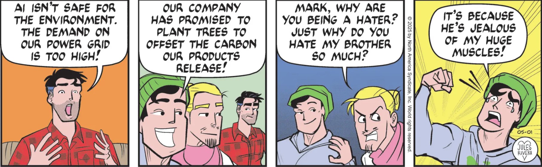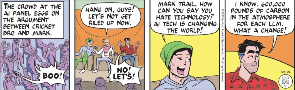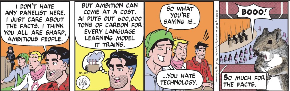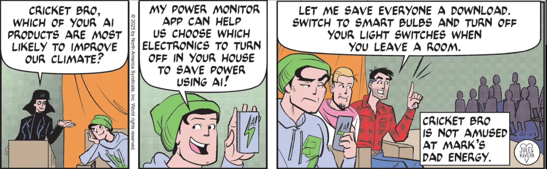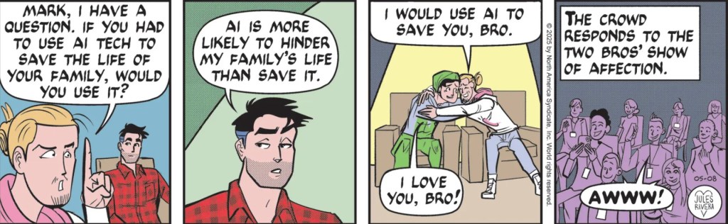 No surprise that comic strips usually don’t have the time or the bandwidth to get into the nitty-gritty of real-world tech. Rivera could’ve linked Cricket Bro’s AI product to something more specific, such as sustainability or healthcare, things relevant to this strip’s reason for existing. Yet, all we have at this point is some vague “AI” product.