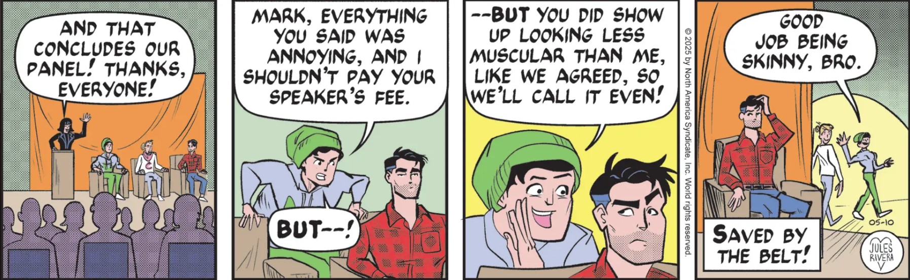 Ah, the perils of comic strip continuity, where deadlines can be tight, especially when the surf’s up. So, maybe Jules Rivera was in a rush and forgot that Cricket Bro wasn’t the one getting the award (panel 1): In fact, he just presented it to Simon Stump two days ago! Was I the only one to catch this!?