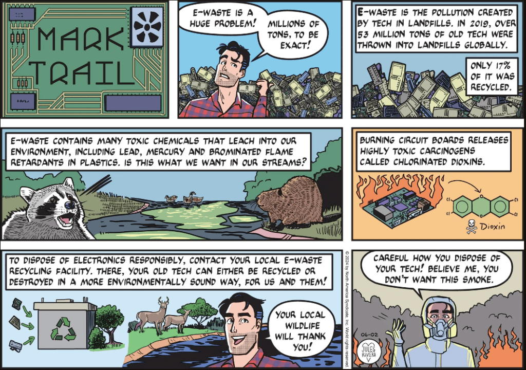 I’m puzzled why Rivera cites statistics from 2019. Perhaps she could have compared that number to a more recent statistic: The UN reported some 68 million tons of global e-waste for 2022, alone. Another issue is that electronic waste contains billions of dollars’ worth of rare earth resources, such as gold, silver, copper, and iron. Yet our country has no national standards, policies, or programs for safe reclamation and disposal. Seems that “recycle” and “reclaim” never made it into the manufacturers’ thinking.