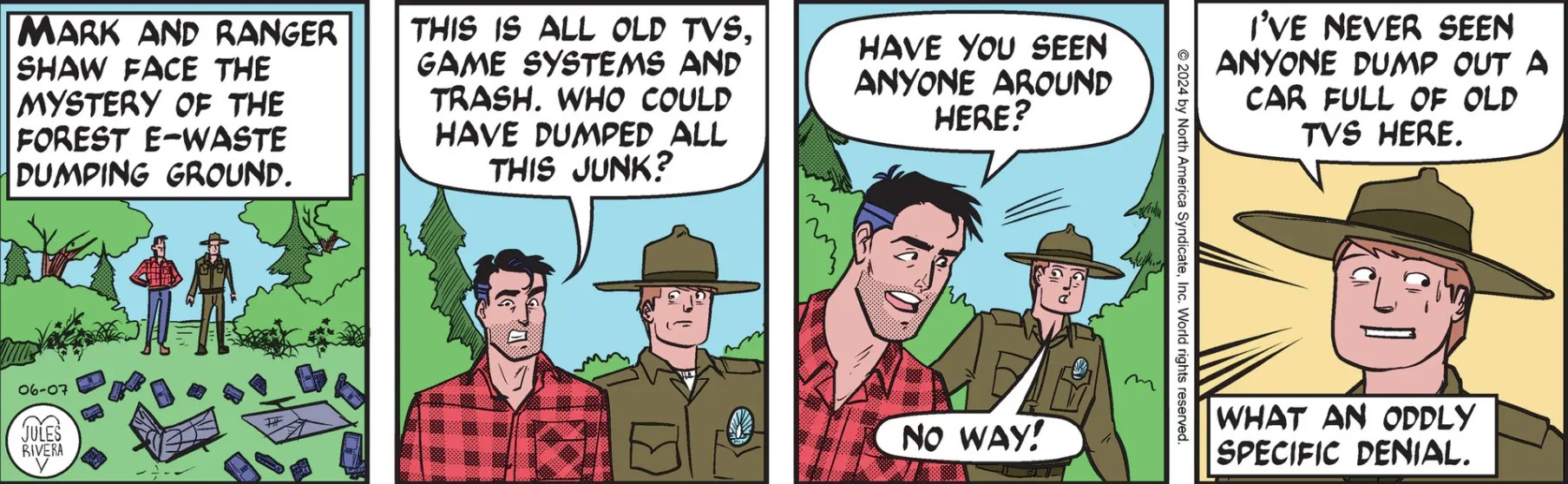 What a coincidence! Rusty tells Mark about his e-waste project for the school science fair, and all of a sudden, Mark has his own show-and-tell about e-waste. I like today’s title panel, though I’d have wanted to see the “Mark Trail” logo appear like actual text on circuit boards. Perhaps, Rivera thought it would be too small? Well, everybody knows the name of this strip, right?