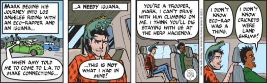 Rivera gives us another animal talk geographically linked to current stories, along with another inventive title panel. But unless you visit or live in Florida, you will likely only see iguanas in zoos and in homes as pets (a role they are not suited for). The iguana is considered a harmful invasive species in Florida. Their existence there is probably due to people abandoning them, especially when they grow up to 6 feet long! Florida is truly America’s favorite dumping ground for abandoned exotic and dangerous pets, including Burmese pythons, boa constrictors, Nile monitor lizards, African monkeys, Cuban tree frogs, peacocks, caimans, and out-of-state college students. Florida: It’s more than just orange juice and beaches!