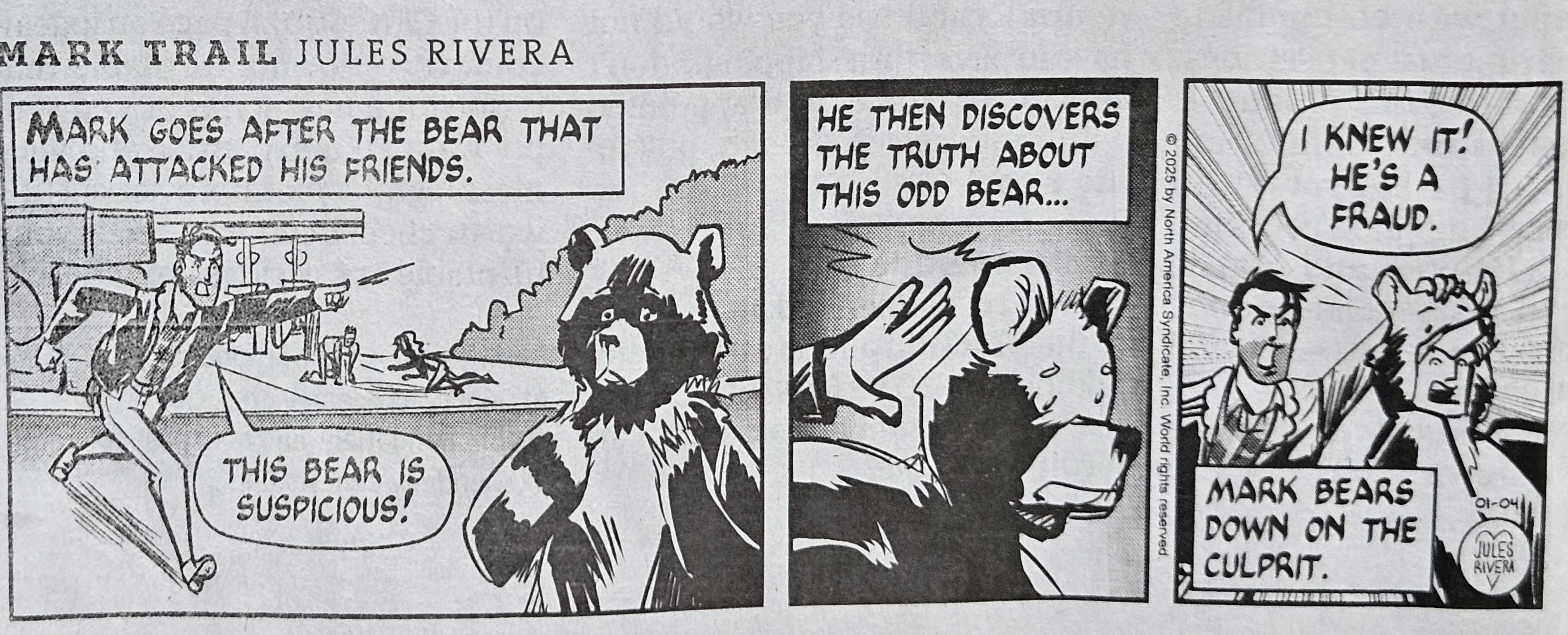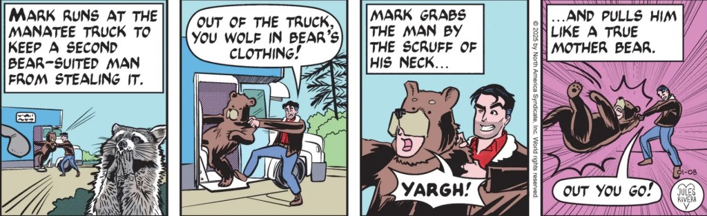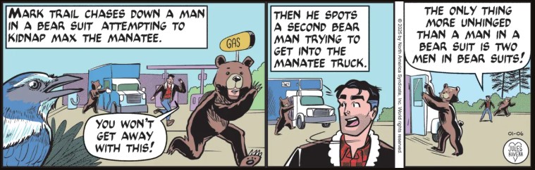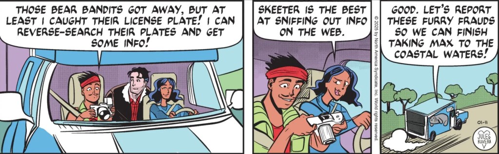 Reader Be Ware of Eve Hill commented on the possibility of a decline in the art of this strip related to the resignation of Tea Fougner, Editorial Director of King Features Syndicate. I mentioned her departure on January 6. My current answer is “Got me!” My understanding is that Fougner was instrumental in bringing Rivera in to update the strip. Given that the art has fluctuated over the past several years, I’m not inclined to believe a causal link to Fougner’s departure. I’m more inclined to think a new director will arrive and promote a different agenda, which might be a bigger concern. King Features owns the Mark Trail strip and Rivera is just the current hired caretaker, as was James Allen before her.