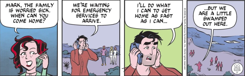 I’m not sure Mark’s logic in panel 1 is accurate. Whole chains of people certain can get washed away, depending on the circumstances. But it’s a good group psychological trick to minimize panic. And it is a shame that Jules Rivera again undercuts the drama and value of Mark’s advice by indulging in buffoonery in panels 2 and 3. A flash flood is a dangerous situation, a guaranteed bit of drama and suspense, made to order. So why piss on it?