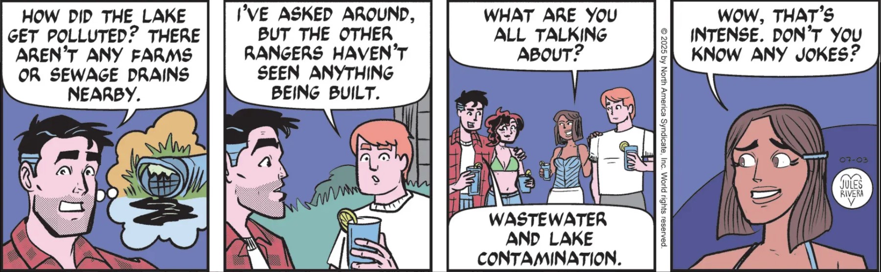 In any event, the investigative groundwork continues even as Ranger Shaw admits they’ve done next to nothing. Certainly, an examination of the wastewater chemical content should help narrow down the possible candidates. Heck, maybe the contamination is brought in at night and dumped, the way people used to get rid of their nonworking appliances. Will Mark bother with any of this?